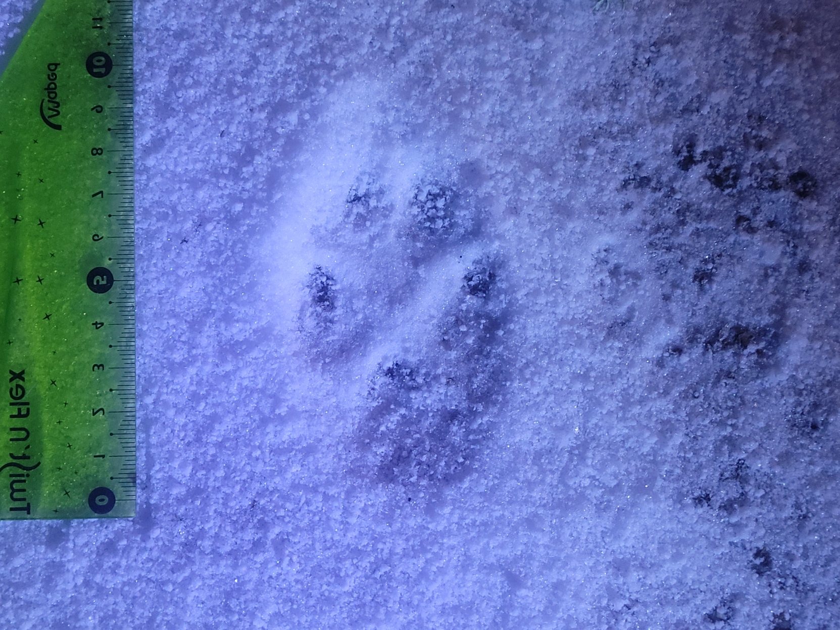 their pawprints are more irregular than a cat’s with each pad farther apart. their hind paws will hit around or directly on the forepaw’s footprint, so it can either obscure the print. try to look for nearby prints to see if this is the case (usually a line of prints or equally spaced prints side-to-side like a wolf’s). keep in mind lynxes have pretty flexy toes so the size can be very variable among individuals and the ground under the snow